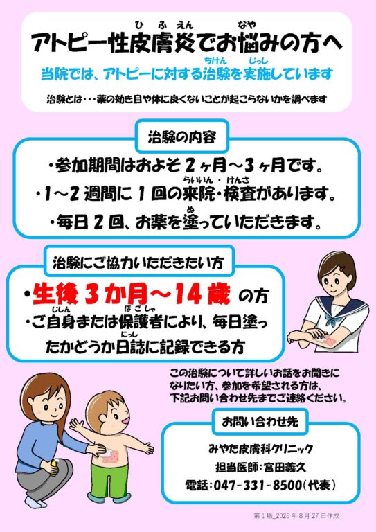 治験の案内 小児アトピー性皮膚炎でお悩みの方へ みやた皮膚科クリニックでは治験にご協力いただける方を募集しております。 治験とは? 新しく「くすり」を世の中に出ためは有効性と安全性を調べる試験を行い、国(厚生労働省) に「くすり」として認めてもらう必要があります。この認めてもらうために行う試験を「治験」と言います。 ご興味がある患者様はメールにてご連絡お願いいたします。 小児アトピー性皮膚炎の治験 この記事のタイトルとURLをコピーする